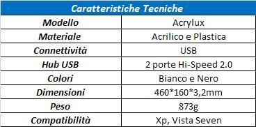 Come si può vedere dalla tabella sovrastante la tastiera ha uno spessore di soli 9.2mm e ciò la rende particolarmente gradevole alla vista. Il materiale usato per la sua costruzione è resina acrilica per il corpo, di color nero nel nostro caso, e plastica per i tasti.